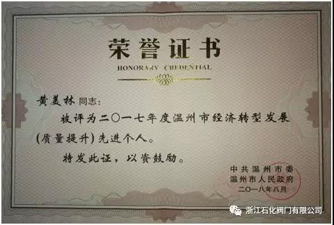 近日,中共溫州市委、溫州市人民政府聯(lián)合發(fā)布《關(guān)于表彰2017年度溫州市經(jīng)濟(jì)轉(zhuǎn)型發(fā)展先進(jìn)集體和先進(jìn)個(gè)人的通知》,浙江石化閥門有限公司副總經(jīng)理黃美林榮獲溫州市2017年度經(jīng)濟(jì)轉(zhuǎn)型發(fā)展質(zhì)量提升先進(jìn)個(gè)人。